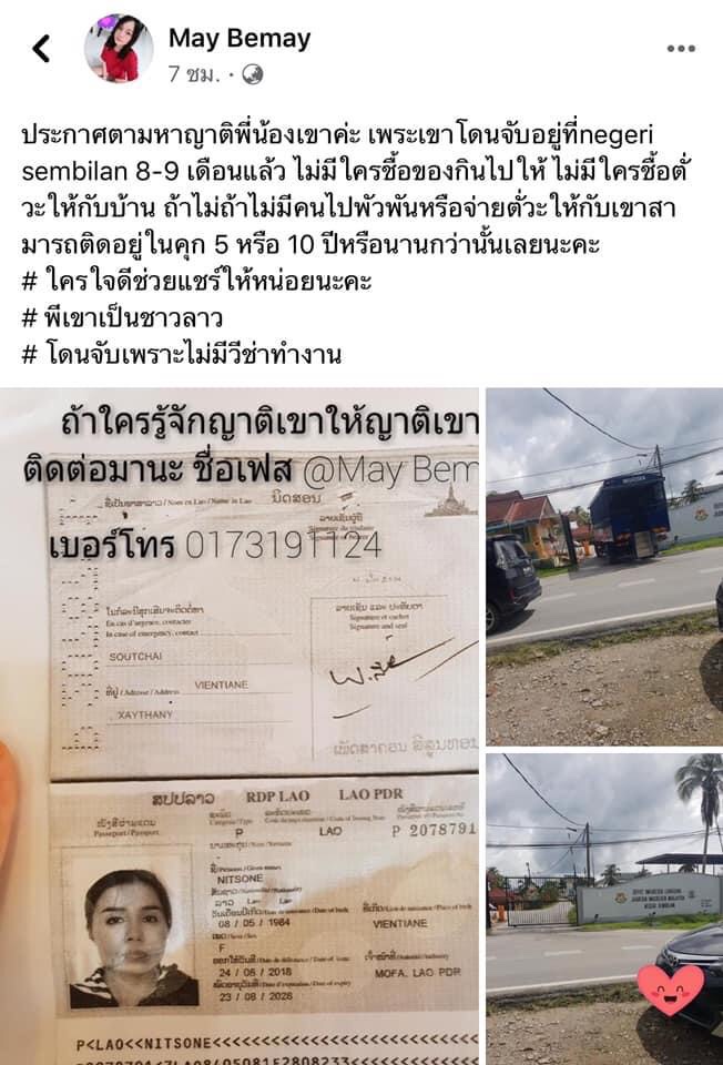 ຜູ້ໃຊ້ເຟສບຸກຊື່ May Bemay ໄດ້ໂພສໃນວັນທີ 16 ທັນວາ 2020 ວ່າ: ປະກາດຕາມຫາຍາດພີ່ນ້ອງເຂົານະ ເພາະເຂົາຖືກຈັບຢູ່ທີ່ negeri sembilan ໄດ້ 8-9 ເດືອນ